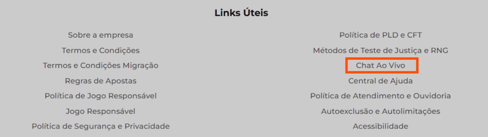 Role até o fim da página → clique em Chat Ao Vivo na seção Links Úteis.