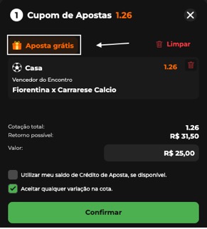 ● Ao montar um bilhete de aposta, o cliente poderá visualizar a Aposta Grátis disponível clicando no bilhete.