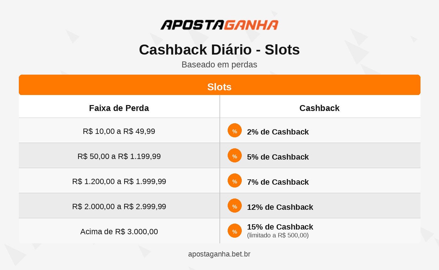 4.1. O cliente receberá um cashback de até 15% em saldo real sobre as perdas líquidas (total apostado - total ganho), conforme detalhado neste regulamento.