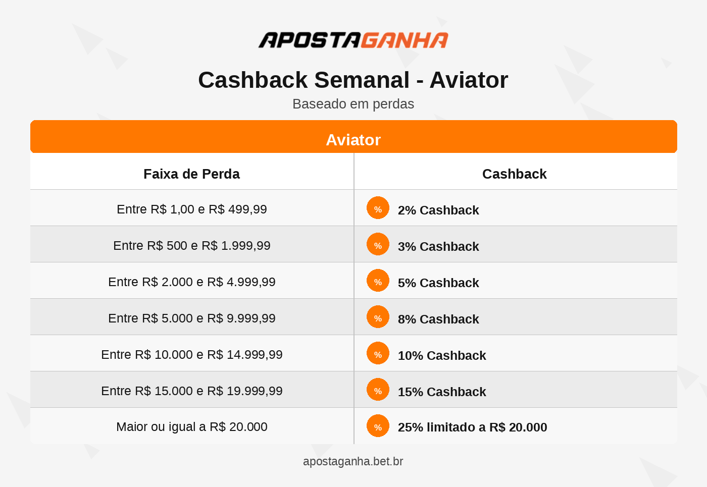 Tabela de Cálculo para o Cashback Semanal - Aviator